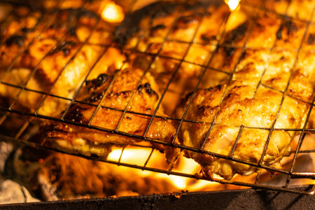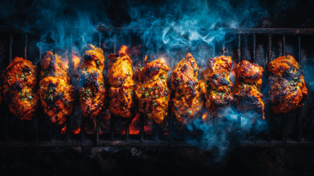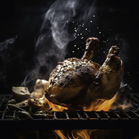 Indulge in the sight of juicy grilled chicken sizzling on a charcoal grill, enveloped in smoky aroma, perfect for outdoor cooking dreams and culinary inspiration.