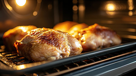 Succulent chicken breasts roasting in an oven, showcasing golden brown skin and rich textures. A perfect addition to any meal preparation scene.