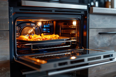 A vibrant assortment of food is being baked in a sleek, modern oven, filling the kitchen with warmth. The inviting glow from inside enhances the culinary atmosphere of this cozy space.