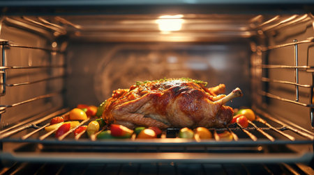 A whole roasted turkey baking in the oven, surrounded by colorful vegetables. The golden-brown skin and aromatic herbs create an inviting home-cooked meal atmosphere.
