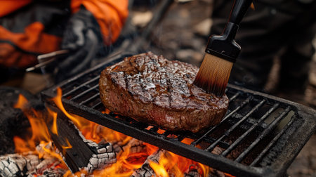 A beef steak being basted with a brush while grilling over an open fire, surrounded by camping equipment.