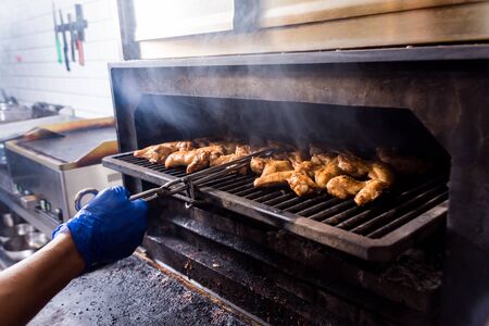 Unrecognizable man hand turning pork steaks on a charcoal barbecue
