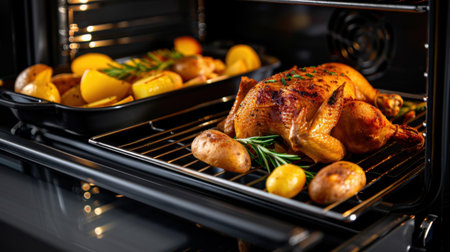 A beautifully roasted chicken with crispy skin in the oven alongside golden potatoes, garnished with fresh herbs, ideal for a family dinner or celebration.