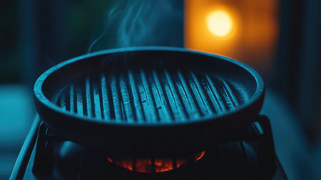 A close-up view of a steam-covered grill pan on a stovetop, set against a softly lit background, creating an inviting atmosphere for cooking delicious meals.