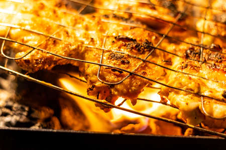 barbecue on the grill. meat on a skewer. cooking meat on fire. Skewers of meat outdoors. Man cooking marinated shashlik, lamb meat grilling on metal skewer. Flames of Fire In The Background