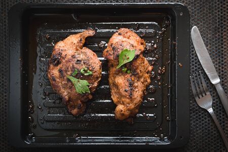 grilled pork chop on grill pan with rosemary. top view. background.