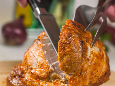 The chef prepares delicious roasted meat. Closeup of a fresh roasted meat
