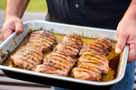hand carrying tray of honey mustard marinated pork chops to barbecue, created with generative ai