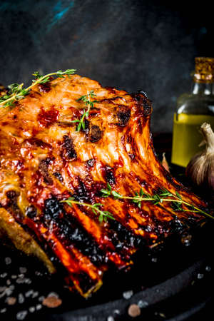 Grilled meat concept. bbq pork ribs with barbeque sauce, olive oil. fresh herbs on dark wooden background copy space