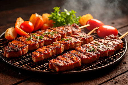 Juicy meat pieces grilled to perfection with a smoky aroma, garnished with fresh herbs. Ideal for culinary enthusiasts and food photography.