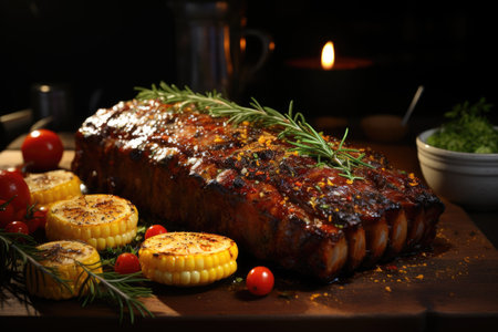 Grill barbecue ribs with sweet corn and ketchup on the wooden table, generative AI
