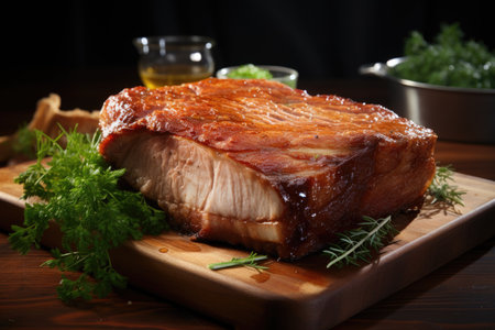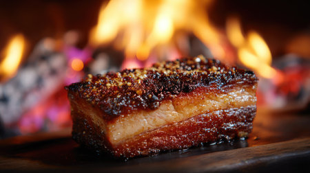 Indulge in a beautifully presented slow-cooked pork belly, rich in flavor, topped with a savory glaze. Perfect for culinary enthusiasts seeking delightful dining inspiration.