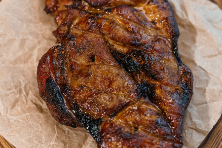 Close-up shot of a succulent grilled meat piece showcasing a rich brown char, perfect for highlighting culinary delights and appealing food presentations.