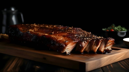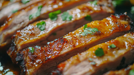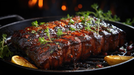 Savor the rich flavor of grilled pork ribs drizzled with a savory glaze and topped with fresh herbs. An appealing dish ideal for any barbecue event.