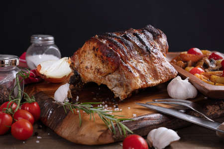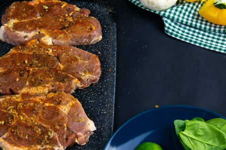 Fresh and juicy pork loin steaks, grilled meats on the wooden board, well-done steaks