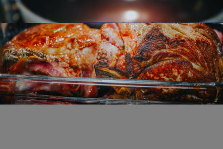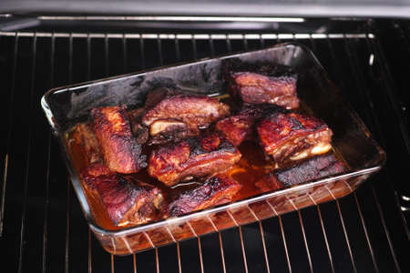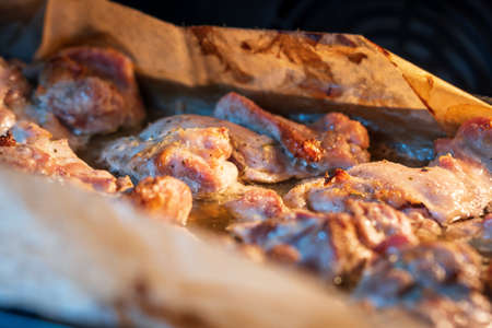 Baked meat cooking in oven
