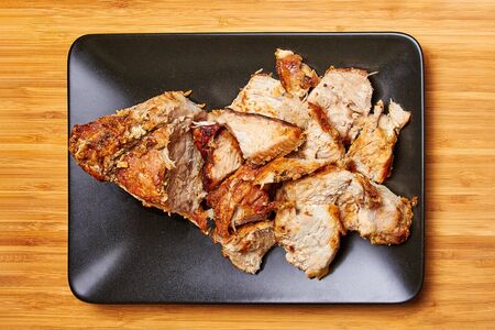 Sliced roasted pork meat on dark gray background. Organic gourmet food concept. Top view, flat lay, copy space