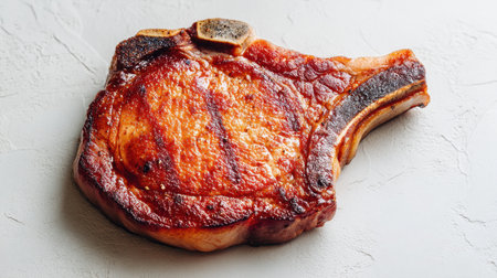 A beautifully grilled bone-in pork chop showcasing a juicy and caramelized exterior, ideal for food photography, culinary presentations, or gourmet recipes.