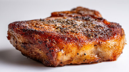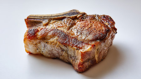 A gourmet pork chop seared to golden perfection with a crispy crust, showcasing appetizing seasonings on a clean white background for culinary artistry.