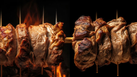 Grilled meat on skewers with flames on a black background.