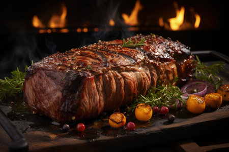 Juicy roasted pork ribs garnished with fresh rosemary resting on a wooden board in front of a burning fireplace, creating a cozy and delicious atmosphere