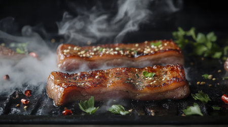 Indulge in this mouthwatering grilled pork belly, beautifully presented with fresh lime slices and herbs. Perfect for a flavorful meal or gathering.
