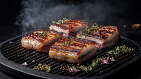 A visually appealing display of pork belly skewers on a grill, with smoky char marks and fresh herbs, set against a blurred outdoor background.