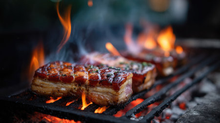 Fat dripping onto hot coals beneath pork belly, creating fiery flare-ups and smoky textures