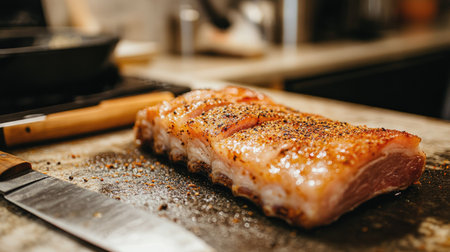 Raw pork belly on a counter, with crispy crackling seasoning and a knife placed nearby.