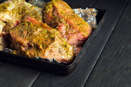 Raw meat veal and chicken legs on a baking sheet are prepared for baking in the oven. The national meat dish is prepared on the eve of the holidays. Free advertising space
