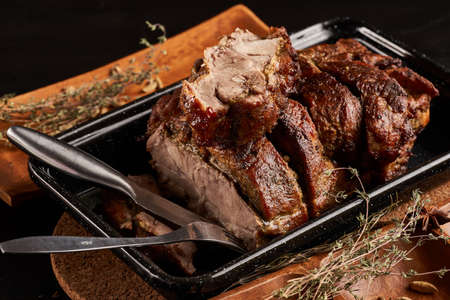 Man cuts roasted pieces of pork shoulder blade in metal plate on dark background