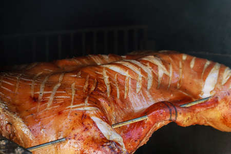 Fried pork. Cooking the whole pig on the grill.