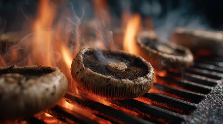 Mushrooms sizzle on a grill, with flames and smoke creating a dynamic, vibrant scene. The mushrooms have a textured, earthy surface and appear juicy as they cook over open fire