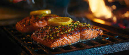 Grilled salmon garnished with lemon wedges served hot on a barbecue grill
