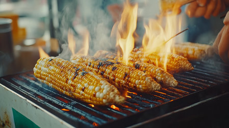 Enjoy the sights and sounds of a street vendor grilling fresh Japanese corn on the cob over open flames. The smoky aroma and vibrant colors promise a delicious treat perfect for summer festivities.