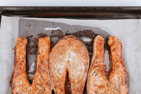 Baked salmon pieces. Juicy appetizing salmon lies on baking sheet. Red fried fish steaks