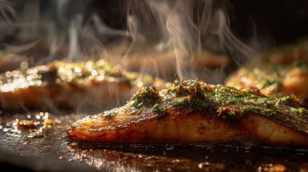 An enticing close-up shot of grilled fish fillet garnished with fresh herbs, steam rising from the hot grill surface, showcasing vibrant colors and textures.
