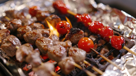 Vibrant grilled skewers featuring colorful vegetables and succulent meat over a charcoal fire, exuding delicious aromas and a summer vibe perfect for outdoor gatherings.