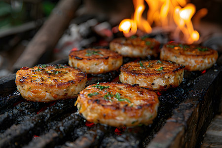 Mouth-watering chicken patties being grilled to perfection on an open flame barbecue. the patties have a golden-brown crust and are garnished with fresh herbs, creating an inviting and delicious outdoor cooking scene ideal for summer gatherings and cookouts. Generative AI