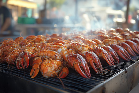 A variety of seafood delicacies sizzling on the grill including lobsters shrimp and corn on the cob