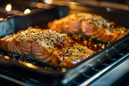 A salmon fillet broiling in the oven with honey, soy sauce and sesame seeds