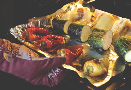 Healthy food. Pepper and zucchini with a ruddy crust are prepared in the oven. Close-up. Grilled vegetables
