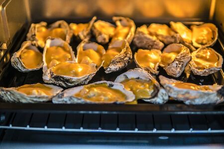 Cooking of Oysters in a creamy sauce and cheese in oven