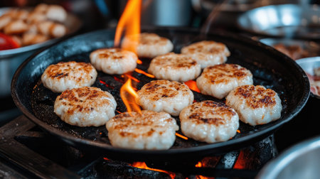 A pan filled with golden-brown dumplings fries over an open flame in a lively kitchen, showcasing the art of cooking and the joy of flavor.