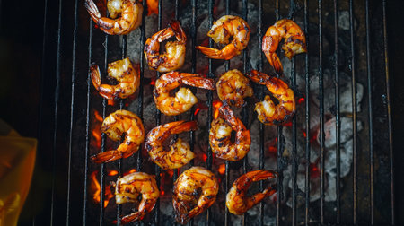 A captivating image of grilled shrimp being cooked on an outdoor grill, with flames licking the shrimp, creating an inviting and appetizing atmosphere.