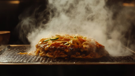 Steaming dish captured in a kitchen, showcasing tender ingredients and vibrant colors. This culinary image represents delicious cooking and flavorful meals.