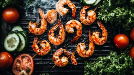 Mouthwatering grilled shrimp skewers arranged with fresh vegetables and aromatic herbs, perfect for a summer gathering or a delightful meal.
