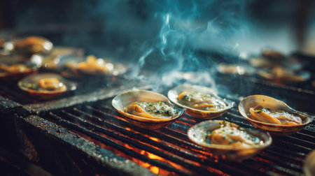 Grilled shellfish cook on barbecue, emitting flavorful smoke and creating a vibrant culinary experience. A perfect outdoor meal that captivates the senses.