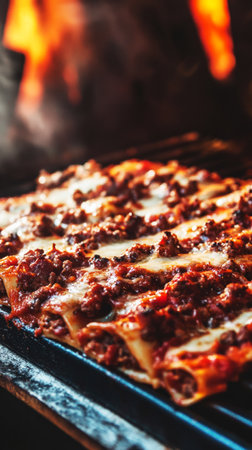 A traditional Italian lasagna is being cooked in a rustic oven, showcasing layers of meat, cheese, and sauce bubbling with flavor, creating an inviting aroma in the kitchen.