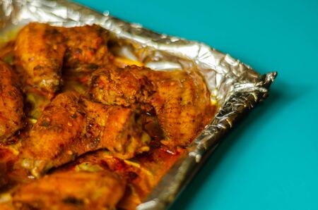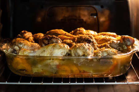 Barbecued chicken legs in the oven with grill mode are prepared for snacks on the table